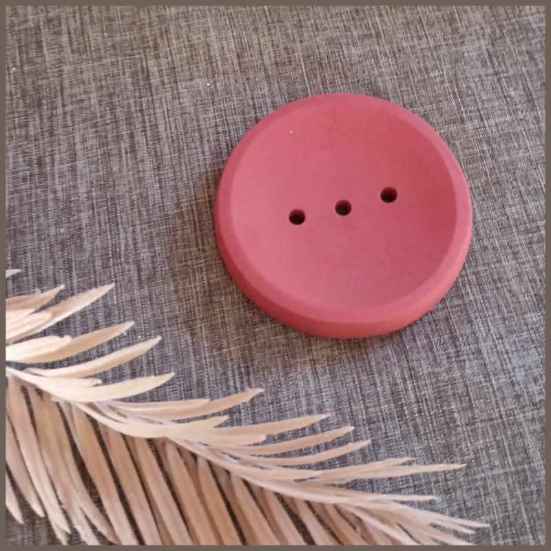 Porte savon en forme de bouton. Chaque pièce est fabriquée à la main par conséquent les couleurs peuvent varier légèrement d'un modèle à l'autre.