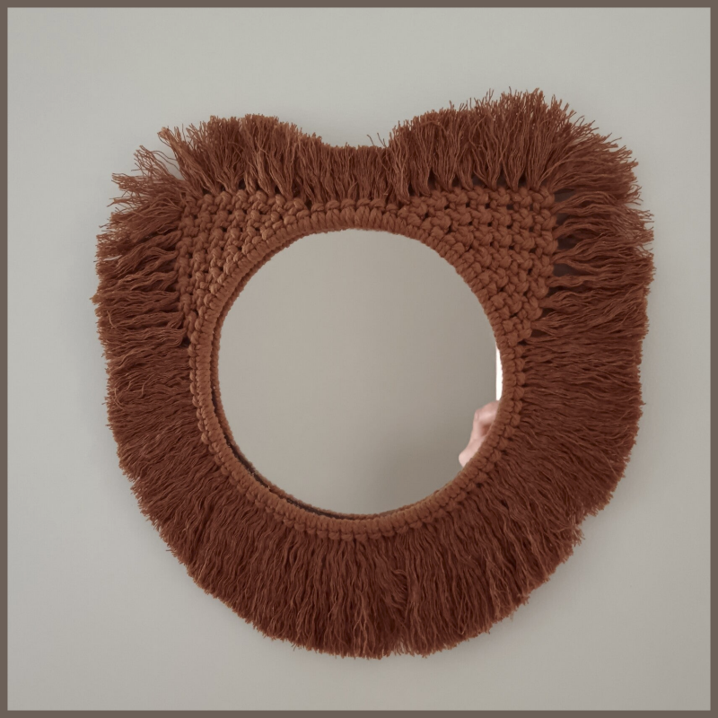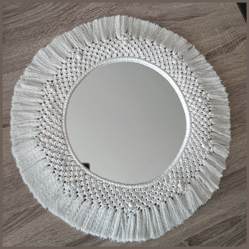 Le miroir en macramé est confectionné entièrement à la main.